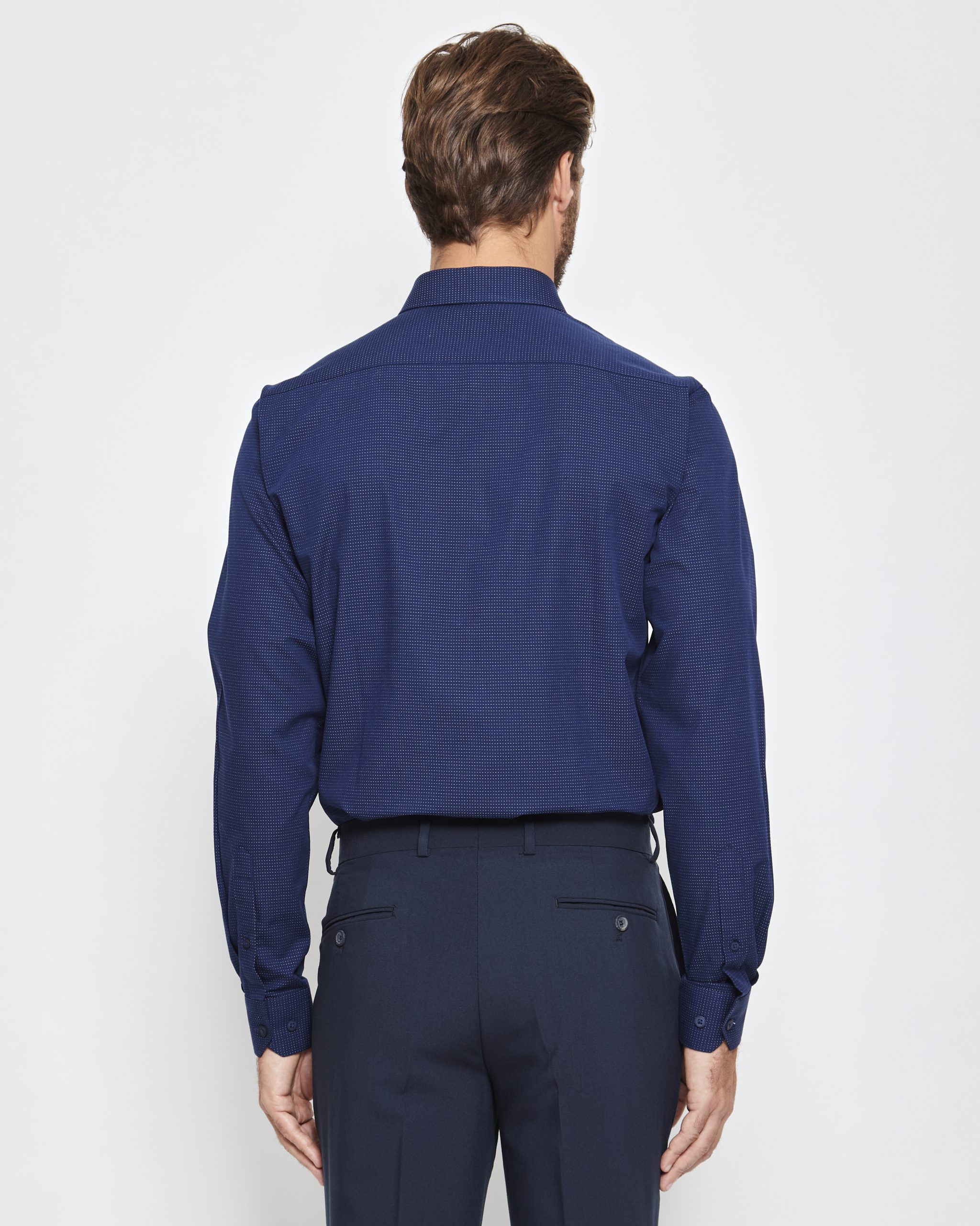 REFERÊNCIA: 1695-19Camisa maquinetada, confeccionada em tecido 100% algodão fio 50. Modelagem slim, colarinho curto, de rigidez média, mangas longas com abotoamento nos punhos, barra arredondada e fechamento frontal por botões.