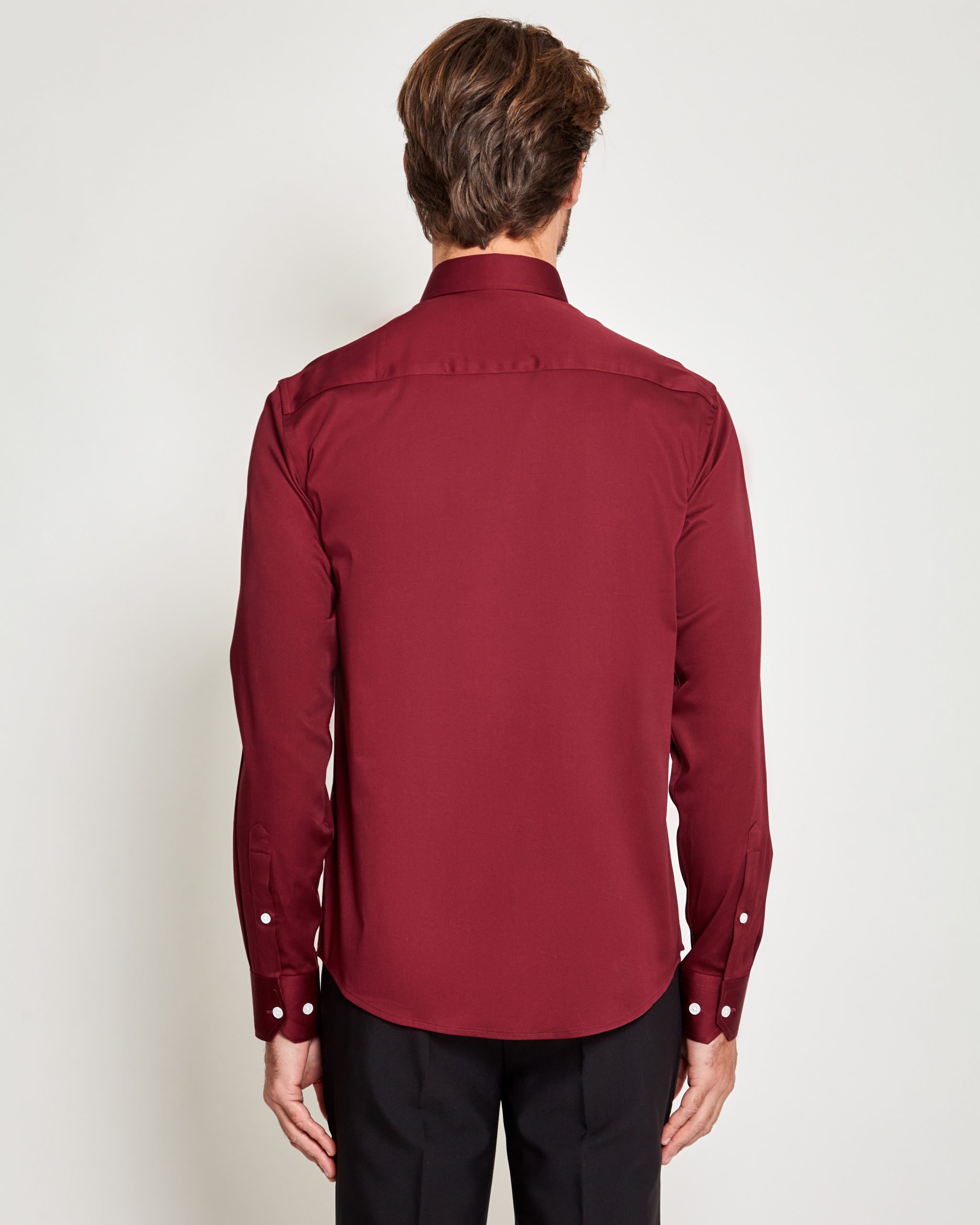 REFERÊNCIA: 1733 VinhoCamisa confeccionada em tecido acetinado de algodão com elastano fio 50. Modelagem slim, colarinho curto, de rigidez média, mangas longas com abotoamento nos punhos, barra arredondada e fechamento frontal por botões.
